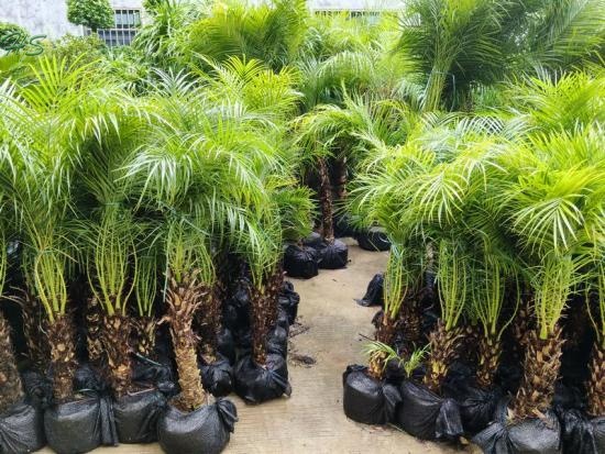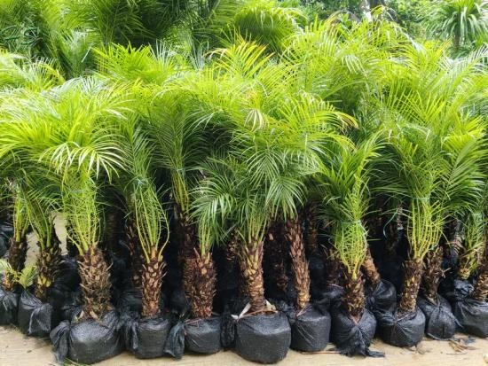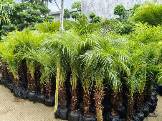 المظهر: نخلة بطيئة النمو، متكتلة، تُشكل عادةً تلة كثيفة تشبه الشجيرة. تفتقر إلى جذع مركزي، بل تنمو من قاعدة مركزية ذات سيقان متعددة. أوراقها، أو سعفها، خضراء داكنة، مروحية الشكل، ويمكن أن يصل طولها إلى 4-6 أقدام، مما يُضفي عليها مظهرًا استوائيًا وارفًا.